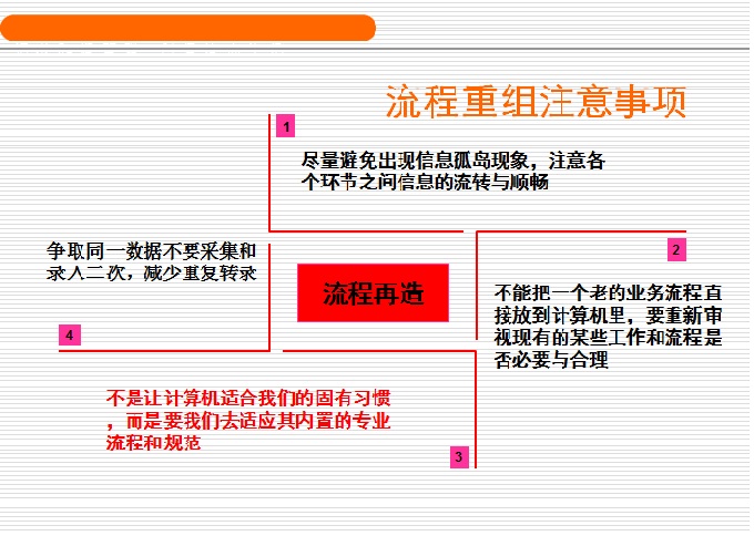 将整个企业体的作业流程及细节进行通盘讨论,检讨出那些作业是无统一而重复进行,那些作业繁锁无效率,那些作业会造成工作瓶颈。针对问题点合理化,订出有效的处理方式,并且将各部门不一致的作业方式统一化。 | |